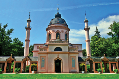 Sarayın kendisi değil ama bahçesi çok görkemli. Bahçe, bünyesinde, büyük bir havuz, çeşitli hayvan ve insan heykelleri, birkaç bina ve tabi, çeşitli çiçek ve bitkiler barındırıyor. Cami 1778 yılında tamamlanıyor. İki minareli caminin mimarisi Klasik cami mimarisinden oldukça farklı. Kubbesi kiliseyi andırıyor, mihrabı bulunmuyor. İbadet edilmesi için inşa edilmemiş, bir anlamda süs olsun diye inşa edilmiş denilebilir. Caminin dış girişinde Arapça yazıları görmek insana farklı duygular yaşatıyor. Ne de olsa Almanya Hristiyanlığın önemli kalelerinden birisi. Protestanlığın kurucusu Martin Luther bir Almandı. Şimdiki Papa da Almandır. Caminin 2006 yılında restorasyonu tamamlanmış ve şu an çok bakımlı bir haldedir. Geniş dikdörtgen biçimindeki avlusunda bakımlı çimenleri olması sıra dışı bir özellik. Zira bildiğimiz camilerde avlu, taş veya mermer döşelidir. Çünkü toplu kılınan namazlarda avluda da namaz kılınır. Ayrıca burada avlu, caminin arka kısmında yer alıyor. Ön kısımda büyük bir gölet mevcut. Caminin gölete yansıması görülmeye değer doğrusu. Caminin içinde 25 tane Arapça yazı var, bunlardan 18 tanesinin altında Almanca çevirisi mevcut. Yazılar alışık olduğumuz gibi ayet ve hadis değil, atasözü veya özlü sözlerden oluşuyor. Arapça yazılarda bazı hatalar olduğu söylense de bu hatalar göz ardı edilebilir. Bu yazılardan iki tanesini sizlerle paylaşmak isterim;