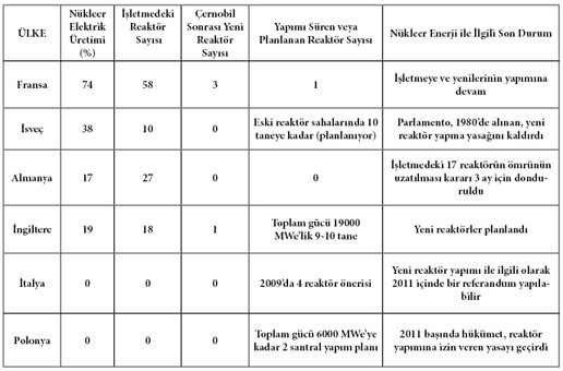 Bu tablodan anlaşılacağı gibi AB ülkelerinin en önemli nükleer enerji üreticileri -Almanya dahil- nükleer santrallerinin sayısını en kısa zamanda artırma yolunda adımlar atıyor.
